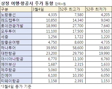 국내 증시가 파란 멍으로 물든 가운데 이번 사태의 직격탄을 맞은 여행사와 항공사 주가 역시 이틀 동안 뚝뚝 떨어졌고, 결국 노랑풍선, 세중, 참좋은여행, 하나투어, 아시아나항공, 제주항공, 진에어, 티웨이항공은 3월4일 52주 최저가마저 뚫고 고꾸라졌다. 3월3일 기준 주가가 가장 큰 폭으로 하락한 곳은 대한항공(-10.32%), 3월4일에는 롯데관광개발(-13.49%)의 낙폭이 가장 컸다.