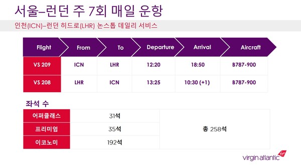 투입 기종은 보잉 787-900이며, 좌석은 ▲어퍼 클래스(비즈니스) 31석 ▲프리미엄(프리미엄 이코노미) 35석 ▲이코노미 192석으로 상위 클래스 좌석 비중을 높게 배치한 것이 특징이다. 버진 애틀랜틱의 비즈니스 클래스는 ‘어퍼 클래스’다. 1-1-1 배열의 좌석 구조로 프라이빗한 공간을 보장하는 한편 기내에서 타 승객과 교류할 수 있는 전용 ‘바(Bar)’ 공간도 마련되어 있다. 런던 히드로 공항 이용 시 전용 터미널(어퍼 클래스 윙)과 패스트트랙, 전용 라운지인 ‘클럽 하우스’ 이용 혜택이 주어진다. 프리미엄 이코노미 클래스는 23kg 수하물 2개, 전용 체크인 라인을 운영해 이코노미 대비 쾌적한 탑승 절차를 보장한다. 일반석(31인치)보다 약 7.6cm 더 넓은 34인치 간격의 ‘이코노미 딜라이트(Economy Delight)’ 구역을 36석 운영한다는 점도 특별하다. 기내에는 한국인 승무원 채용은 물론 한식으로 구성된 기내식, 소주 칵테일 등 한국 노선 맞춤형 서비스도 포함됐다.