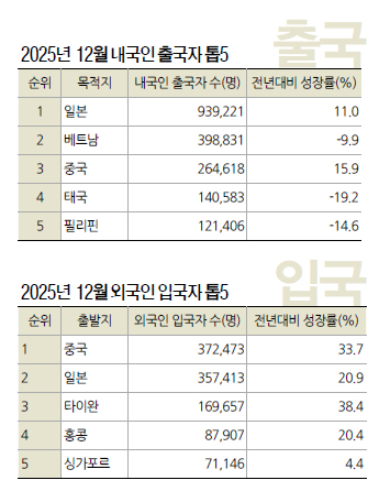 2025년 12월 내국인 출국자 수는 전월 11월과 비교해서, 외국인 입국자 수는 전년 12월과 비교해서 성장률이 높았다. 법무부가 항공기의 최초 도착지 및 최종 출발지를 기준으로 산출한 ‘출발·도착지별 출입국자 현황’에 따르면, 2025년 12월 내국인 출국자 수는 274만8,794명으로 전월보다 11.3%, 전년동월보다 1.1% 늘었다. 전월과 전년동월 대비 모두 플러스 성장을 기록하며 한 해를 마무리했다. 12월 내국인이 가장 많이 출국한 목적지는 변함없이 일본으로 전년동월대비 11.0% 증가한 93만9,221명이 찾았다. 그 뒤를 베트남(39만8,831명, 9.9%↓)과 중국(26만4,618명, 15.9%↑), 태국(14만583명, 19.2%↓)이 이었다. 12월 외국인 입국자 수는 156만3명으로 전월대비 4.8% 줄었지만 전년동월과 비교해서는 19.0% 늘었다. 중국에서 한국으로 입국한 외국인이 12월에도 1위 자리를 지켰다. 12월 중국에서 한국으로 입국한 외국인은 2024년 12월보다 33.7% 증가한 37만2,473명에 달했다. 일본(35만7,413명, 20.9%↑)과 타이완(16만9,657명, 38.4%↑), 홍콩(8만7,907명, 20.4%↑) 순으로 그 뒤를 이었다. 싱가포르가 5위에 오른 점이 특징적이다.