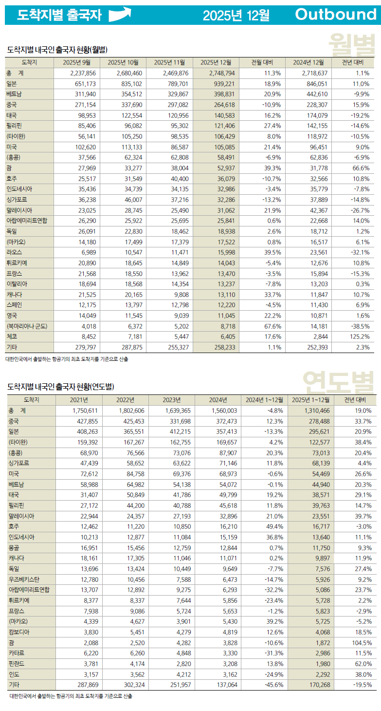 2025년 12월 | 도착지별 내국인 출국자 현황