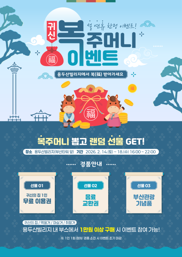 도심 전망 명소에서도 설맞이 이벤트가 이어진다. 용두산공원 일대에서는 ‘용두산빌리지 시즌3’가 연휴 기간 특별 연장 운영된다. 민속놀이 체험과 함께 ‘귀신 복주머니 이벤트’가 마련돼 가족 단위 방문객뿐만 아니라 외국인 관광객에게도 색다른 명절 경험이 될 것으로 기대된다.